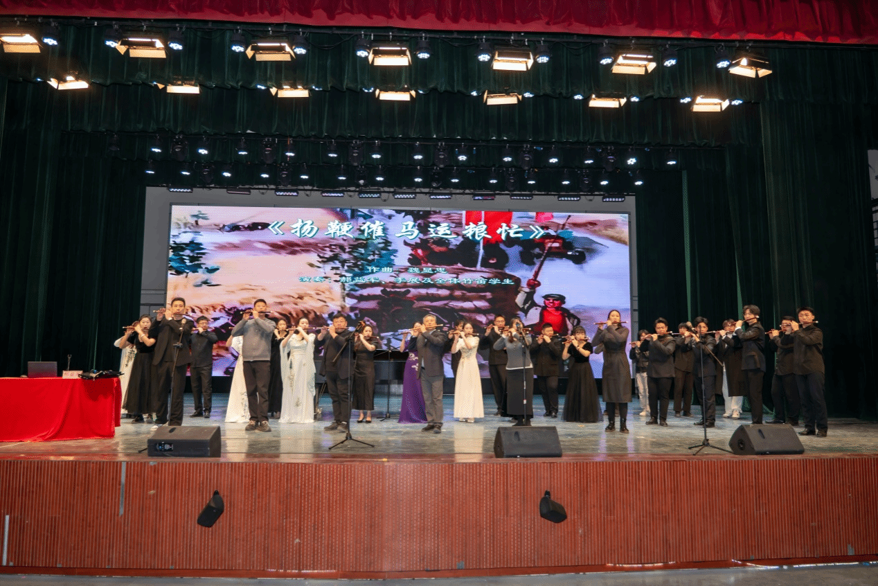 的竹笛专业学生联袂献艺,以多元曲目呈现竹笛艺术的丰富面貌。开场笛子重奏《山东秧歌》热烈明快,勾勒出齐鲁民间音乐的浓郁风情;《春风夜雨情》《祁连音画·舞沙》与《挂红灯》在抒情与技巧之间收放自如,展现了竹笛音色的细腻层次;郝益军教授创作的《泉》以清澈灵动的音乐意象引发共鸣,彰显作品的审美格调与地域文化气息;《万年红》在笙与梆子伴奏的烘托下更显质朴热烈;《热情与冷漠的邂逅》、重奏《乡念》及《山村迎亲人》分别从现代语汇、群像表达与民间叙事角度拓展了竹笛的舞台表现力;《夸山东》《三五七》与《向往》进一步呈现了传统曲牌与当代创作的互文关系。最后,郝益军教授及在场的竹笛专业师生齐奏《扬鞭催马运粮忙》将活动推向高潮,铿锵昂扬的旋律引发现场同学们的共鸣,现场反响热烈。