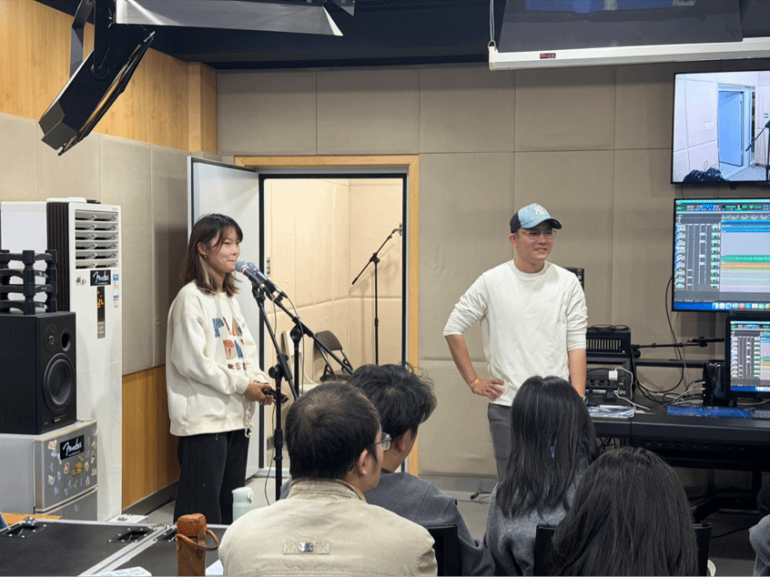讲座开始前,王建成对张天阳的到来表示欢迎,简要介绍了学校美育、社会美育、群众美育的内在联系,督促大家积极投身到群众美育的热潮之中,从庄户剧团、小剧小戏等汲取灵感,把自身的专业优势转化为美育优势。随后,张天阳结合个人职业发展经历从录音核心要素等实用话题切入,提出录音人声判定的四大核心维度——“SPEECH、MIX、TWANG、BELT”,为在场师生搭建起人声录音的认知框架。为让录音理论的讲解更易落地,他特别邀请现场同学担任素人歌手进行采样示范,聚焦非专业素人录音的关键技巧展开细致讲解。针对素人录音常见痛点,张天阳分享了三大核心方法:一是通过语言沟通破冰演唱者与录音师的屏障,帮助演唱者正确演唱状态,同时根据演唱者实时表现灵活适配设备;二是采用故事讲述法与个人情绪调节技巧,帮助演唱者为作品注入真挚情感;三是展示返听设备对录音工作的重要性,直观呈现设备对演唱效果的实际影响。