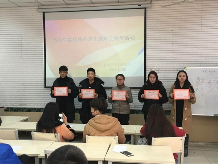 在多媒体一教室对前期心理主题班会评比活动中优秀班级进行了的表彰。