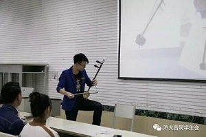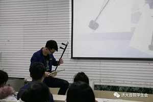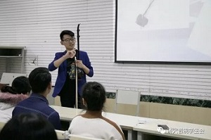 晚七点,讲座正式开始。本次讲堂主讲人是2015级器乐班杨宇晨。主讲人从音乐基础理论、乐器演奏等方面的讲解入手,结合具体乐器实物介绍了二胡、高胡、中胡、板胡等胡琴相关学术知识。同时,主讲人用自己多次的演出经历,向大家阐述了二胡的多彩魅力与音乐所带给他的美好回忆。当他谈到二胡界著名演奏家、作曲家阿炳和刘天华两位先生时,对两位老先生平生贡献与经历更是娓娓道来,让在场同学感受到了音乐的魅力。激动时刻,奏起了一首极其优美、凄婉的二胡曲《风吹过的街道》。在乐声中,现场听讲座的同学颇感意犹未尽。活动最后,主讲人与听众进行了良好的沟通互动,大家用掌声对主讲人的精彩讲解表示感谢。