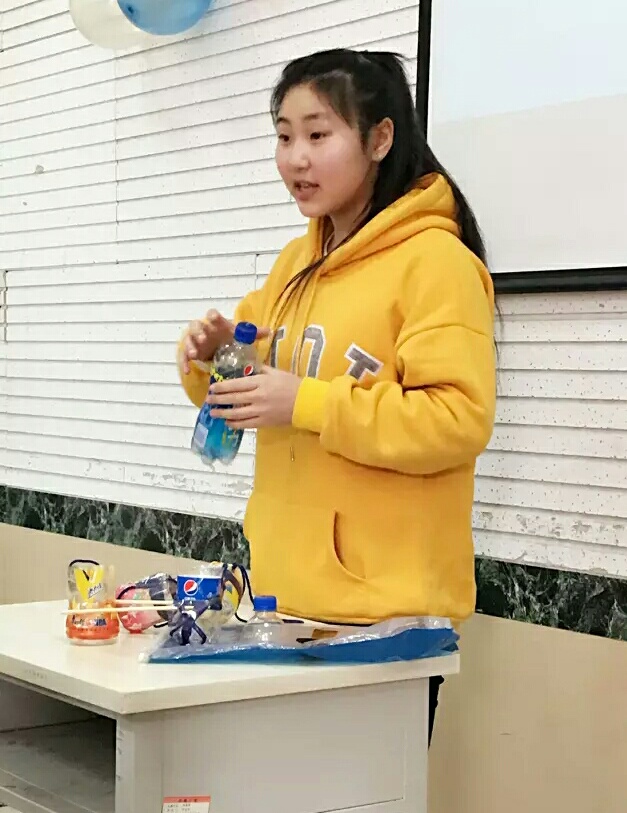 学习部部长杨宇晨也积极参加了此次活动,他完成的塑料瓶三件套很新颖,也看出他的认真。平时生活中随处可见的塑料瓶,却被他的巧手做成了美观实用的物品。阚俊同学帮助部长进行解说,这小物品会为我们紧张的生活增添色彩。虽然杨宇晨未能来到现场,但他的心意与理念也会顺利传递给每一个人。