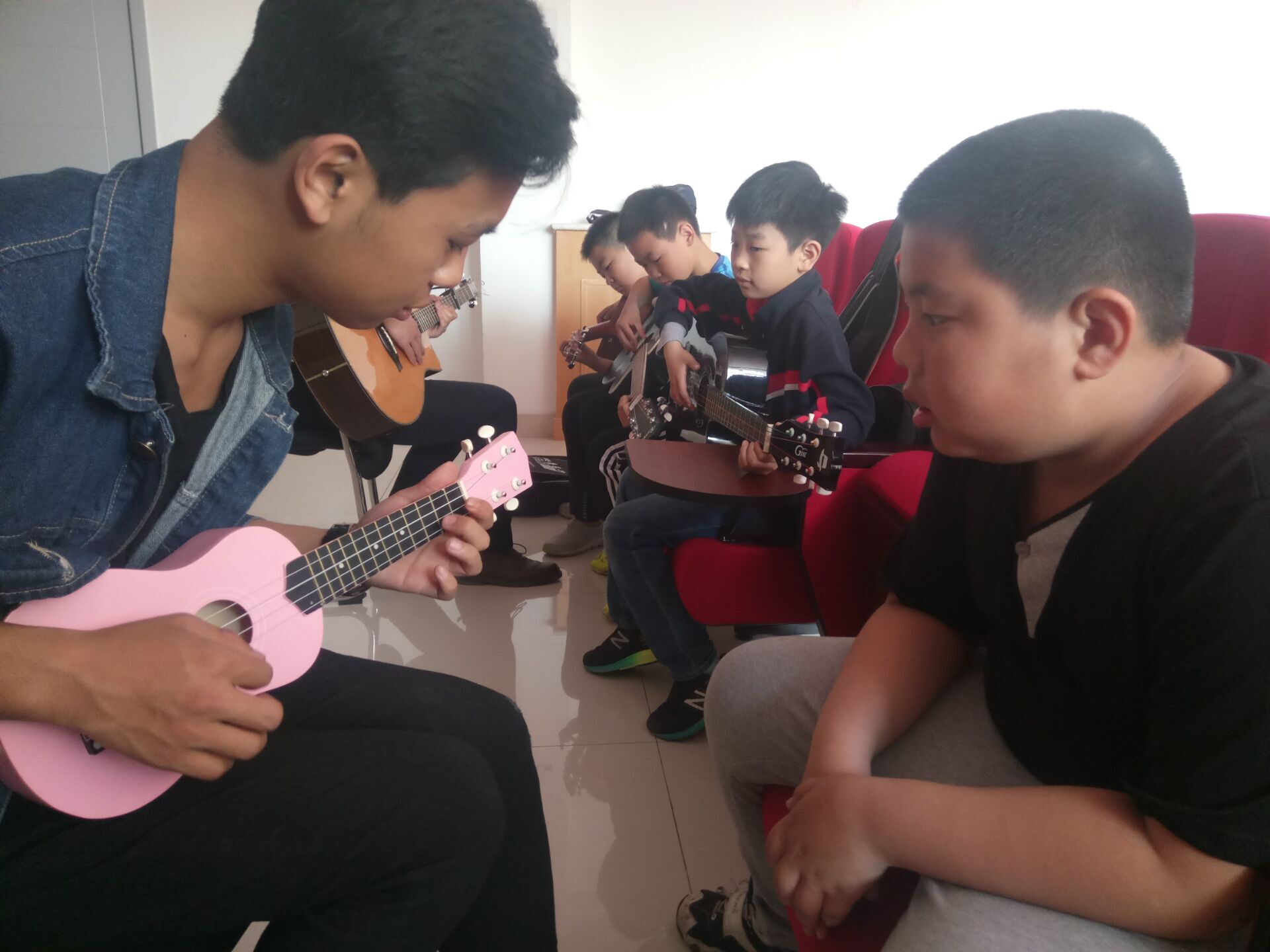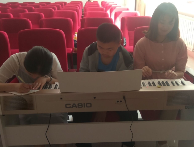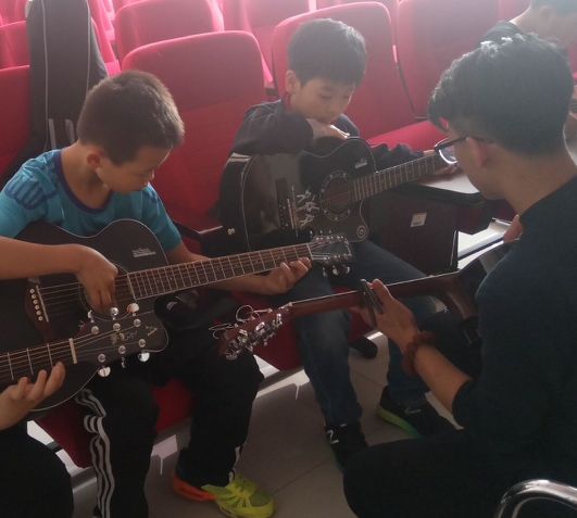 九点正式开始上课,在交流过程中发现多数孩子对吉他、尤克里里和钢琴兴趣浓厚,所以志愿者们就这三项乐器对孩子们进行了基础教学。在教授吉他和尤克里里时,志愿者们针对手指的灵活技巧方面展开专训为以后同学们的专业学习打下基础;教授钢琴时,在识谱速度和视奏能力方面进行培训使得同学们的演奏技巧更加成熟。在教学过程中孩子们热情不减兴致勃勃,我们的志愿者们也认真专心颇有耐心地教孩子们各种演奏的技巧。在活动过程中教室里充满了悦耳的音乐声,十一点我们结束了今天的课程,然而孩子们还饶有兴趣地围着志愿者们进行询问。在这个过程中,孩子们和志愿者们的友好互动使得这个教学顺利进行,这次活动培养了孩子们的兴趣爱好及其对于某一项爱好的专心程度也使得我们的志愿者“老师”们学习如何教授知识,增强了教学体验。为更好的监督孩子们练习及演奏,我们的志愿者们和学生家长建立了微信群,为孩子们打好基础作出措施。