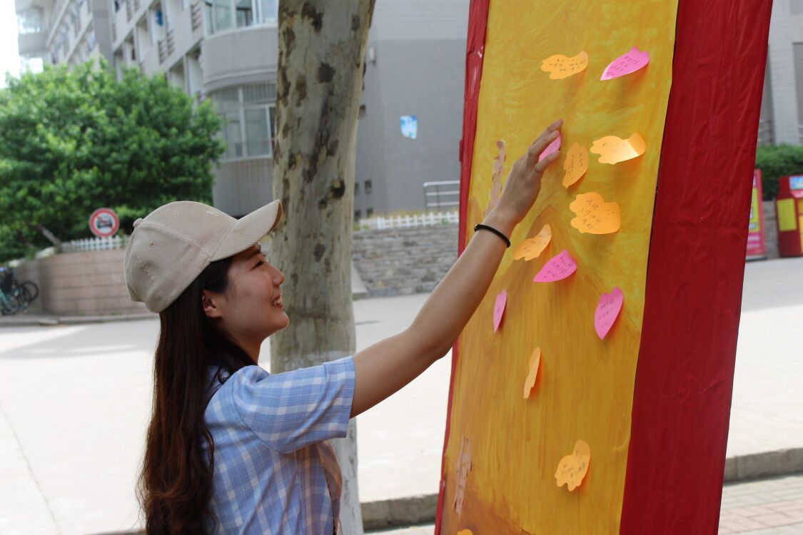 志愿者拿出笔和明信片,邀请过路的同学们一起来给母亲写一些感谢的话,由我们寄出去,将远在学校的我们把对母亲的爱寄到自己的家乡;体育学院志愿者拿出五颜六色的便利贴,和过往的同学们一起把献给妈妈的话语写出来,贴到我们的公益画板上;美术学院志愿者拿出她们的画板,按照我们过路的同学的要求一张张令人满意的画作从他们手中诞生,大家都满载而归。