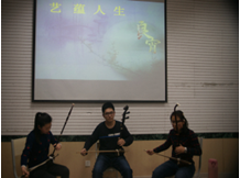 活动开始,团委书记高学德对本次活动发表了讲话,阐述了艺蕴人生活动的主要意义,希望同学们能更好的了解各种艺术专业对生活与学习的影响,为大家提供一个良好的学习平台。器乐专业学生孙菁翼担任为本次活动的主讲人,主讲人首先给我们讲解了二胡的构造,及二胡演奏时不同的指法。随后她又为我们讲解了刘天华,华彦钧等二胡大师的学习经历,通过讲解让我们更深刻了解了作家和他们的创作背景。主讲人在给我们讲解的时候以幽默的语言方式带动了全场的气氛。在有奖竞猜的环节中,在场的观众积极踊跃,有效的学习与娱乐结合在一起。最后向我们介绍了二胡的十大名曲,《二泉映月》、《寒风春曲》、《良宵》等。活动最后,由器乐1401班的三位同学为我们现场进行了演奏,琴声绕梁,胡韵悠扬,在场的每一位同学都沉迷在他们的表演中。