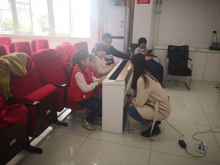 按照以前报选的器乐小组,学生们开始分组上课。学习钢琴的学生在课上学习了认琴键和两个手合起来弹12345,除外还让他们练习了曲子。学习尤克里里的学生们这节课的任务是音阶练习,老师们还带着他们练习了曲子是《圣诞铃声》。